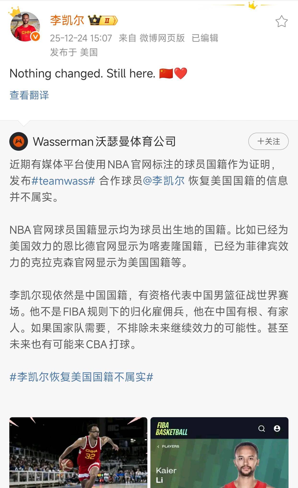 不过,李凯尔的经纪公司今天上午出来澄清了这件事。他们说,NBA系统里“Country”那一栏只是显示球员的出生地,并不代表国籍。而且李凯尔的国籍还是中国,他依然可以代表中国队出战。