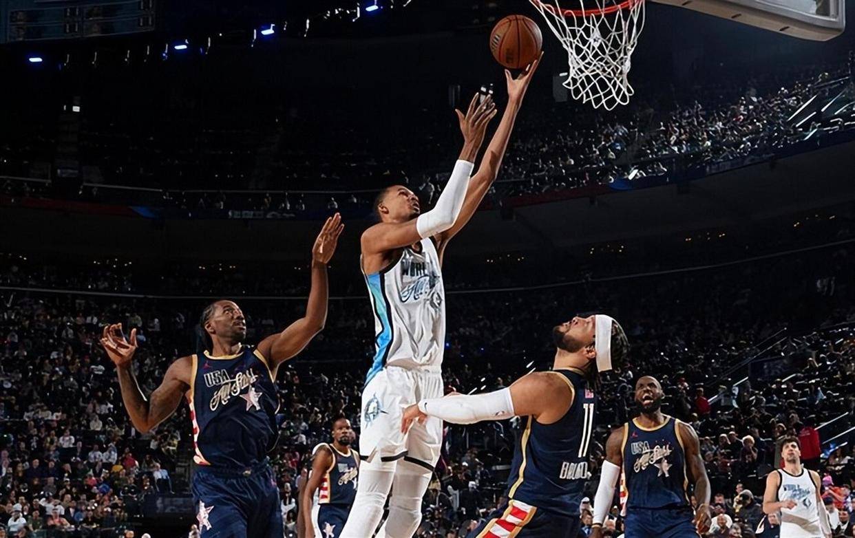 这招还真灵。 第一场,世界队对上美国新星队,火药味就出来了。 法国“蜘蛛人”文班亚马一点没客气,不到10分钟,5投4中,三分、罚球全中,高效砍下14分,还顺手送了3个大帽。 但新星队那个叫爱德华兹的年轻人,浑身是胆,关键时刻一个三分,硬是把比赛拖进了加时。 加时赛里,新星队一鼓作气,以37比35先拔头筹。 你看,才第一场,就有加时,就有绝杀球的气氛了。