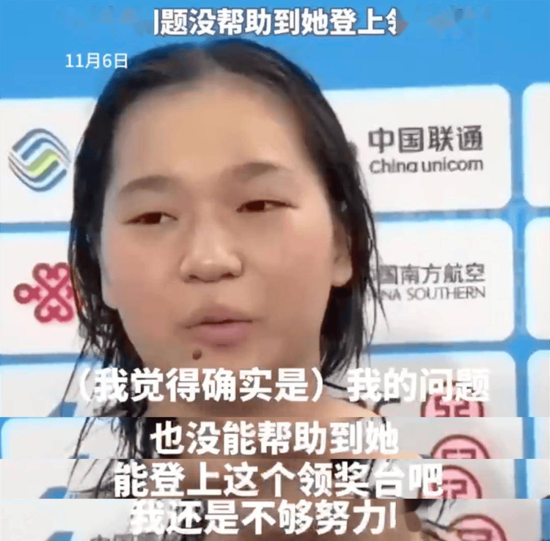 赛后,全红婵面对镜头自责道:“我觉得确实是我的问题,没能帮助到我的队友登上领奖台,我还不够努力吧。”