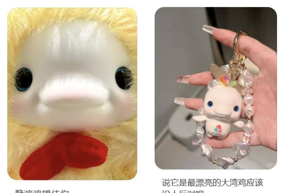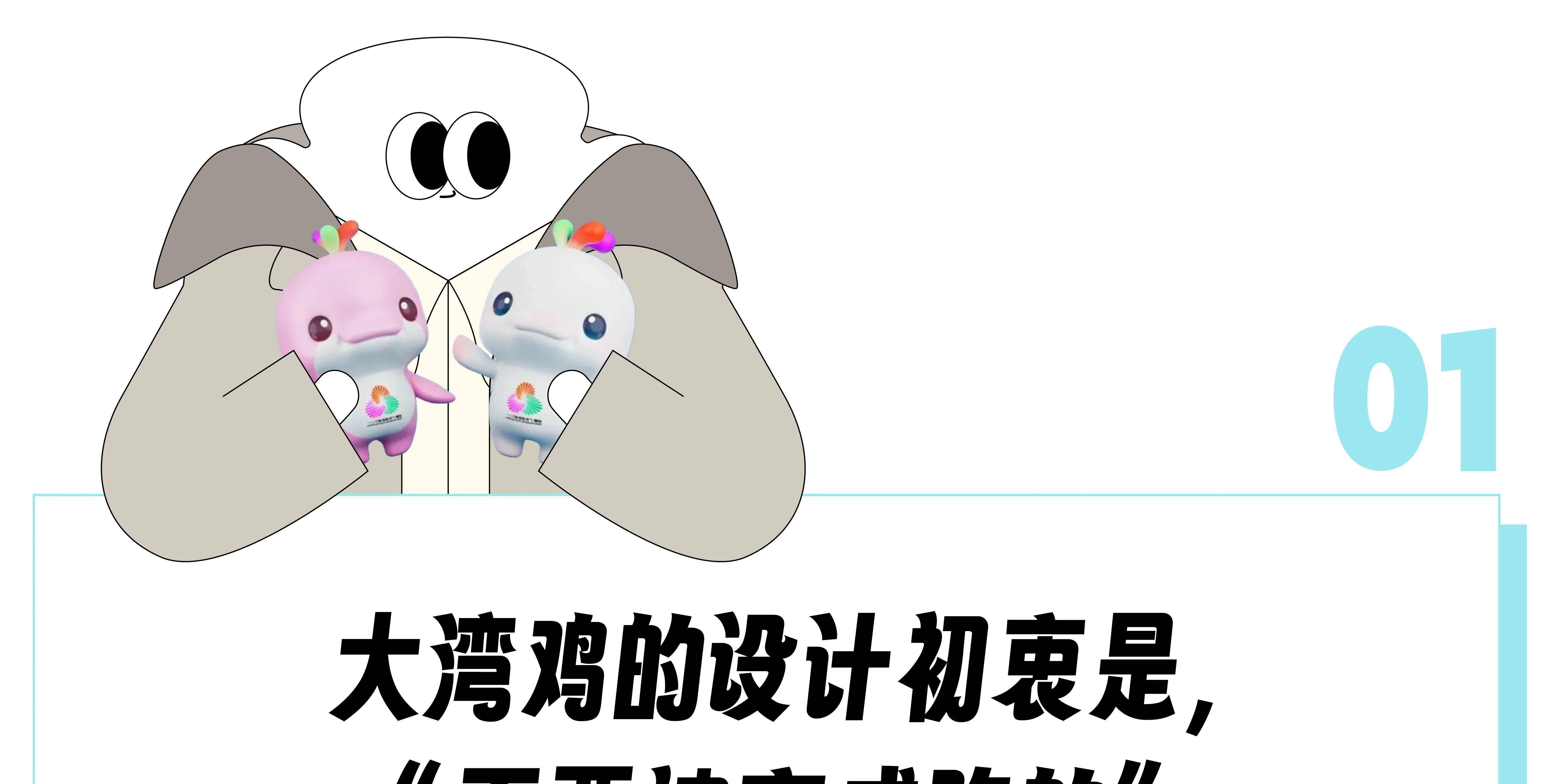 “大湾鸡”在设计之初,原型的确是两只中华白海豚,就像它们的原名也不是“大湾鸡”,而是“喜洋洋”和“乐融融”。设计团队负责人刘平云解释,中华白海豚是“海上国宝”,和大湾区有深厚联系,所以作为这次全运会的吉祥物。一白一粉,粉色是白海豚运动后皮肤充血的颜色,契合了“运动”主题。