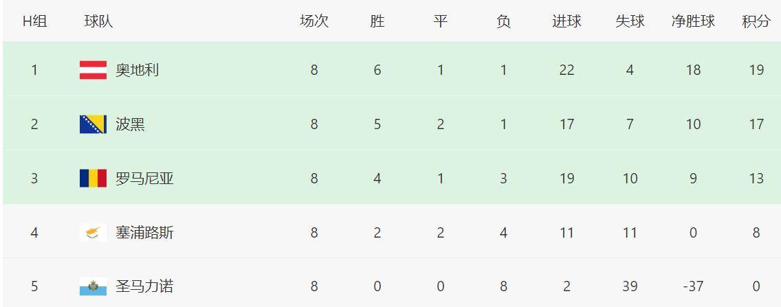 最终,奥地利队以19分锁定小组头名,成功晋级世界杯,而波黑队则以17分位居小组第二,将参加附加赛的争夺。